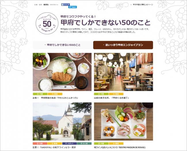 山梨県甲府市は、集英社コミュニケーション・デザイン室が企画から取材、編集までを担当したポータルサイト「甲府でコウフクやってくる!甲府でしかできない50のこと」をオープンした。 「甲府でしかできない50