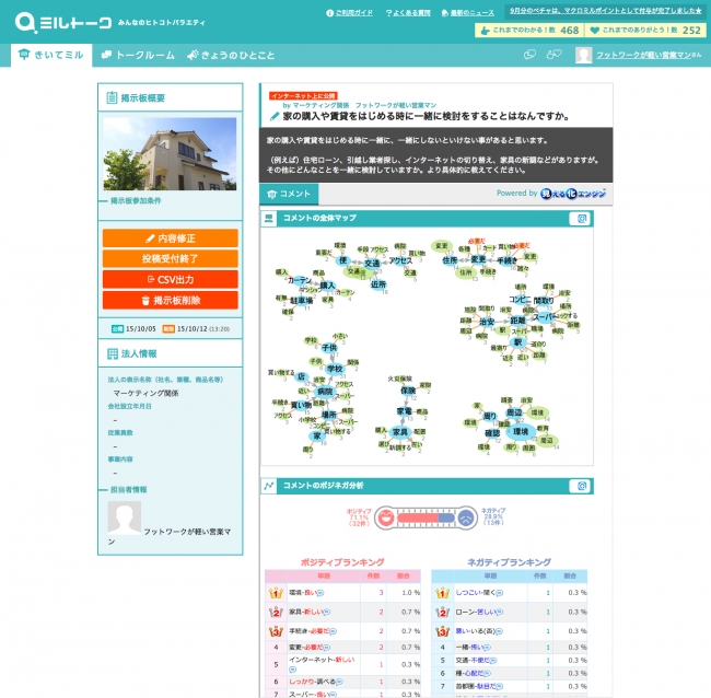 マクロミルは、業界初のユーザトークサービス「ミルトーク」に、投稿コメントの分析機能『テキストマイニング(ライト)』を搭載し、オプション機能として10月7日より提供を開始する。 「ミルトーク」は、企業の