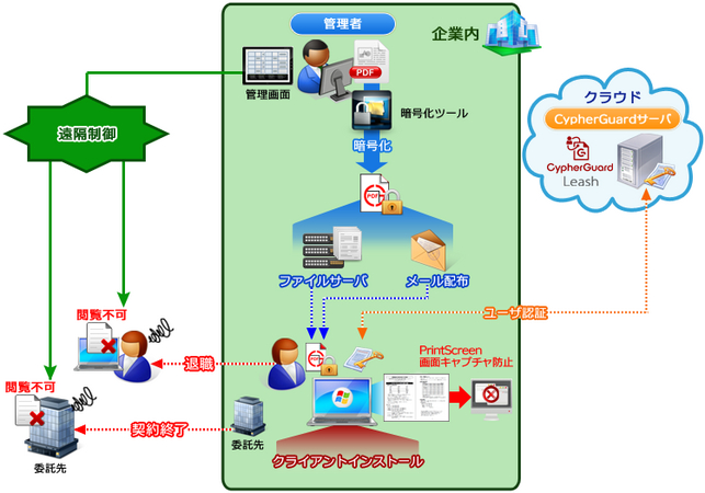 各種セキュリティソフトウェアを開発・提供するサイファー・テックは、社内文書の不正漏えい防止に加えて、退職や契約終了などにより閲覧対象から除外された人物に対して、遠隔制御で以後の閲覧を禁止できるクラウド