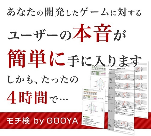 システム開発とスマートフォンアプリ検証サービスを行うGOOYAは、事前にスマートフォンアプリユーザーのモチベーションを検証するサービス、「モチ検」を12月3日、新規本格リリースする。 「モチ検」はスマ