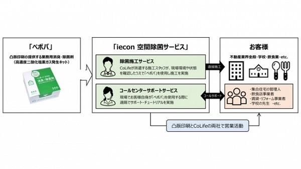 凸版印刷とCoLife(コーライフ)は、各領域で高まる環境衛生へのニーズに対応するべく、業務用消臭・除菌剤「ペポパ」を活用した除菌施工サービス「iecon(イエコン)空間除菌サービス」を6月10日より提供開始する。