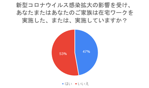 まず初めに、「新型コロナウイルス感染拡大の影響を受け、あなたまたはあなたの家族は在宅ワークを実施した、または、実施しているか」と質問した。その結果、47%が「はい」と回答。次に、「在宅ワークや外出自粛を開始してから、自宅の電気代は上がったか」と質問をしたところ、43%が「はい」と回答した。