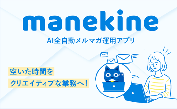 「manekine」は、AI技術によって商品紹介メルマガの作成を行うだけでなく、メルマガの開封率やクリック率を分析し、自律的に配信精度を向上するアプリ。「manekine」を利用することで、これまで業務負担の大きかったメルマガ運用の簡便化を実現し、メルマガ運用に費やしていた時間や労力を、他のクリエイティブな業務に活用することができる。