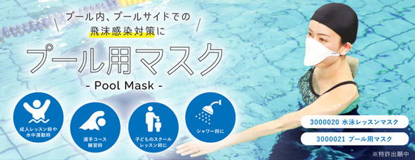 「プール用マスク」(子ども用の商品名は「水泳レッスンマスク」)は、装着することでプール内での飛沫の拡散を軽減し、新型コロナウィルスの感染予防の効果が期待できるマスク。待ち時間や指導者の話を聞く際、プールサイド、シャワー室などではマスクで鼻口部分を覆い、泳ぐ時は首に掛け外して使用する。最大100cm伸縮するスパイラルコードがゆるやかなフィット感と、子ども一人でも着脱が簡単に行える仕様になっている。サイズは子どもから大人までを対象にS、M、Lの3種類で、カラーはシロ、サックス、ミントの3色。すでに大手スポーツクラブのプール施設で採用が決まっており、当面はスポーツクラブなどの法人・教育機関・官公庁などへの提案に注力していく。