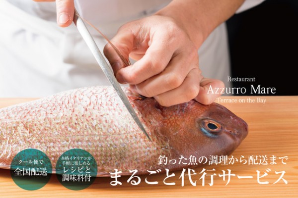 「RESTAURANT Azzurro Mare Terrace on the Bay 」は「目の前に広がる海の景色と長崎の「じげもん」素材を楽しむ」をコンセプトに、目の前に広がる海を眺めながら、太陽を浴びてのびのびと育った長崎の地野菜や、近隣で採れた新鮮な魚介、地元産のオリーブオイルなどを活かしたモダンイタリア料理を楽しめるダイニング。この度、釣った魚をシェフが調理し、配送までを代行する新しいサービスを提供する。