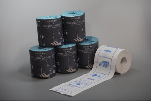 長塚さんは「スカイツリーや自由の女神といった世界中の名所が、もしかすると海の底に沈んでしまうかもしれない。その危機をすごく端的に表現してくれた作品でした。」とコメント。販売開始日より、水族館内のトイレにも本トイレットペーパーが設置される。