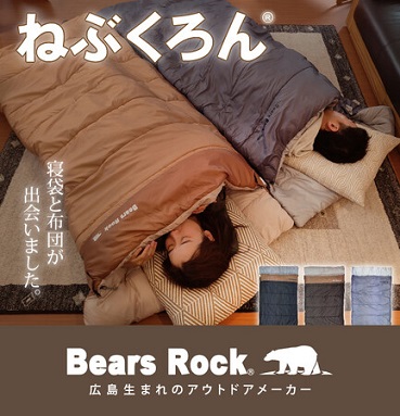 Bears Rockは、使う人に寄り添った製品づくりを心がけている。もっと快適に使ってもらうため、利用客のレビューをもとに日々改良を重ねている。寝袋のような布団のような新ジャンルの「ねぶくろん」は、利用者に愛顧され、売上累計1万8635個を突破した。寝袋と布団のいいとこどりした「ねぶくろくん」は、ふわふわで暖かく保温性に優れており、軽量でコンパクトに仕上げた。「掛け」「敷き」を分離できるので、普段使いや帰省・来客用など様々なシーンで使用できる。(実用新案登録済み)