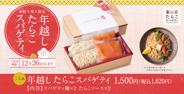 価格は、テイクアウト「年越したらこスパゲティ」(スパゲティ麺×2 たらこソース×2)1500円(税抜)。予約期間は12月8日~26日。商品引き取り期間は12月30日・31日。販売店舗は、「東京たらこスパゲティ」南池袋店、原宿表参道店、渋谷店。