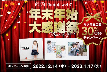 「PhotoJewel S 年末年始大感謝祭」期間は12月14日~2023年1月17日。PhotoJewel Sで人気の光沢商品を30%OFFで購入できるクーポンを利用できる。