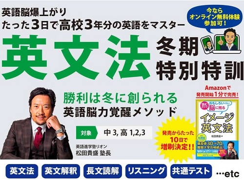本講座では、リオン塾長オリジナルテキストで、必要な用法をピンポイントで学ぶ。基礎力がない生徒はもちろんのこと、受験生で基礎力を短期間でなんとか身に付けたい生徒にとっては最適な講座となっている。なお、「カリスマ塾長」と呼ばれる松田さんの初著書「読むだけでおもしろいくらい脳に残る イメージ英文法」は、12月6日に発売。発売から1分でAmazon在庫切れとなる好評ぶりで、わずか10日で増刷も決定した。