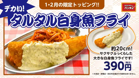 パンチョが運営する「スパゲッティーのパンチョ」は、期間限定トッピング「タルタル白身魚フライ」を1月16日〜2月末まで販売する。
