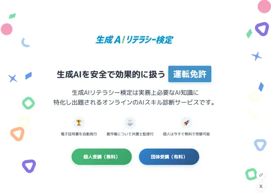 試験内容は30問/30分で構成されており、オンラインですぐに受講でき、合格者は即時でデジタル証明書を発行。名刺への記載やSNSプロフィールでの活用も可能だ。個人受講は現在のところ無料で提供されており、生成AI活用の第一歩として誰でも参加できる(法人・団体での一括受講を希望の場合は問い合わせが必要)。