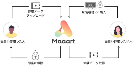 「Maaart」は、従来の動画配信である映像や音声に加えて、動きや力加減など複数の感覚情報を含んだ体験データをやりとりするための新しいデジタルマーケット。体験のシェアラーが体験データをアップロードすると、即時に査定が行われ、報酬がカウントされる。アップロードされた体験は順次ユーザーに提供され、体験そのものが流通する仕組みだ。