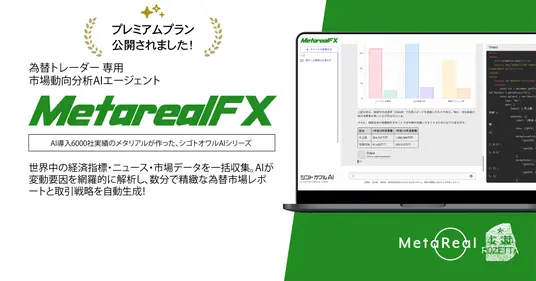 ロゼッタは、為替市場動向分析レポート作成AIエージェント「Metareal フォレックス(Metareal FX)」を1日20回・月200回使える月額5万円(税込)のプレミアムプランを7月17日より提供開始した。
