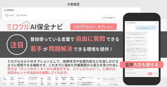 「ミロクルAI保全ナビ」は、現場で日常的に使う言葉で修理履歴を検索でき、過去の事例をもとに適切な対応策を提示するチャット型AIアシスタント。経験の浅い人でも安心して初動対応に取り組める環境を提供するとともに、拠点や世代を越えた知識共有を促し、技術継承と保全体制の強化を実現する。