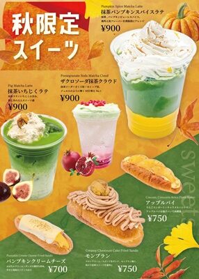 いちじく、ざくろ、かぼちゃ、栗、りんごなど秋の果物や野菜を使った新作ドリンク3種と進化系あげパン3種が登場。日本の秋、深まる。抹茶とともに。実り豊かな秋を感じる収穫祭メニューを楽しめる。