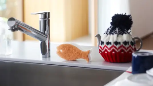 1998年の発売以来、4半世紀以上顧客に愛用されている「おさかなスポンジ」は、そのアイコニックな形と使い心地のよさが特長。おさかなの形が手になじみ握りやすく、長めのサイズでコップの底まで届く。ナイロン不織布・ウレタン・脱膜ウレタンの3層構造で、汚れ落ち、泡立ち・泡持ち、水切れに優れている。また「おさかなスポンジ」は、2018年12月14日付で特許庁より立体商標として登録された。食器洗い用スポンジとして、国内初の立体商標登録となる。