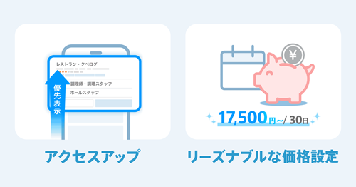 本サービスは、飲食店が効率的に人材を採用できるよう、求人情報を検索結果で上位に表示するサービス。料金体系は月額固定費のかからない「チケット制」を導入しており、各種割引の適用で1枚1万7500円(税別)より購入できる。採用したいタイミングに合わせて1枚から利用でき、1店舗あたり30日間、求人情報を優先的に表示する。複数枚を同時に利用すれば、さらに注目度を高めることも可能。