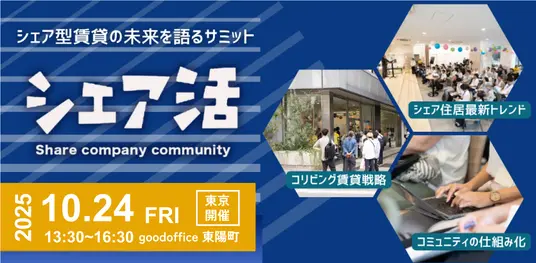 グッドルームは、コワーキングスペースとサウナのサブスク「goodroom lounge」にて、シェア180、絆家と共同で、シェア型賃貸(シェアハウス・コリビング)に特化した事業者向け合同サミット「シェア活2025」を、10月24日に「goodoffice 東陽町」にて開催する。