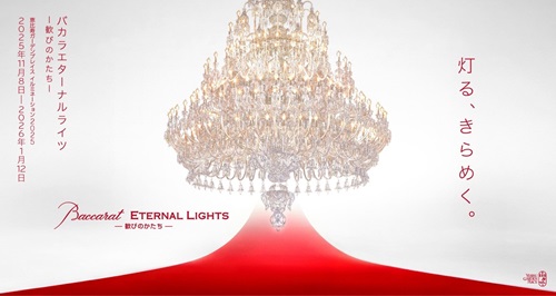 バカラ社と恵比寿ガーデンプレイスが1999年から開催している「Baccarat ETERNAL LIGHTS-歓びのかたち-」は、恵比寿の冬の風物詩として親しまれ、今年で26回目を迎える。2025年のテーマは「灯る、きらめく。」。高さ約5m、幅約3m、クリスタルパーツ総数8500ピース、ライト総数250灯の世界最大級のシャンデリアが灯す輝きが、恵比寿のまちを華やかに包み込む。その制作には、フランス最優秀職人(M.O.F)をはじめとする熟練した職人の技と、1万5000時間もの長い時間が要されている。イベント初日である11月8日17時からは、点灯式も予定している。