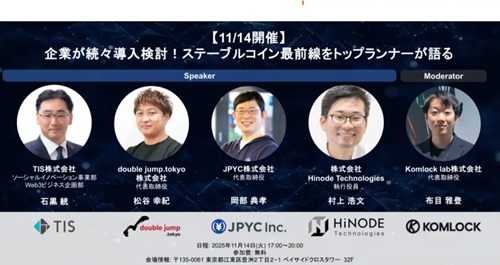 Komlock labは、TISインテックグループのTISとdouble jump.tokyoが共同で開催するステーブルコイン活用をテーマにしたイベントのモデレーターとして登壇する。