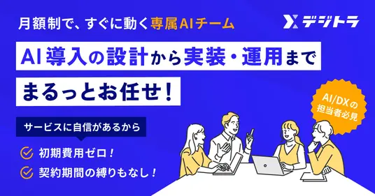 「デジトラ」は、AI導入の企画・戦略設計から、実装、運用改善までをワンストップで支援する月額制のAI導入支援サービス。主な導入支援領域は、営業・マーケティング・人事・総務などのバックオフィス業務を中心に幅広く対応している。最大の特長は、採用コストゼロで3名のAI専門家を即時アサインできること。企業の状況に合わせたAI活用戦略を策定し、ツール選定から構築、定期的な改善提案までを包括的にサポートする。また、導入後の「運用・定着」フェーズのサポートも充実。些細なことでも相談可能なチャットサポートや、隔週の改善ミーティング・KPIモニタリングを通じて成果を可視化し、AI活用が企業文化として根づくまで伴走する。
