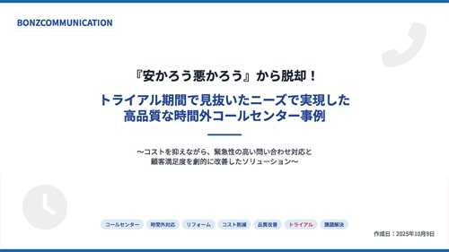 ボンズコミュニケーションは、リフォーム事業を展開するクライアントに対し、時間外コールセンターサービスを提供し、対応品質の劇的な改善とコスト最適化を両立させた導入事例を発表した。