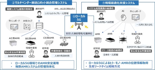 複数メーカーのAMRの工場業務に合わせた活用を統合管理の手間を掛けずに実現し、ローカル5Gによる位置測位データを活用しヒト・モノ・AMRの配置/作業工程最適化を実現することで、作業の効率化や人手不足解消をめざす。
