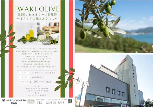 いわきワシントンホテルの宴会場「椿山荘」は、磐栄ホールディングスとコラボレーションし、ディナーイベント「第2回いわきオリーブ収穫祭~イタリアの風をあなたに~」を、11月29日に開催する。