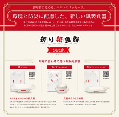 奥村印刷は、企業の年始の挨拶回りで使用するお年賀商品として、環境と防災に配慮した新しい紙製食器「折り紙食器beak(ビーク)」の法人向け販売を本格的に開始した。