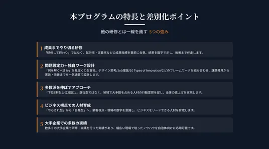 多くの人材育成プログラムが「研修して終わり」になりがちな中、ディシプリナのプログラムは「成果までやり切る研修」を標準化している。本プログラムは、単なるデジタルツールの使い方を学ぶのではなく、DXの起点となる「問いの力(=問題設定力)」を徹底的に重視する。参加者は、デザイン思考やJob理論といったフレームワークを用い、地域や企業の実際の課題を「顧客視点」で深く洞察。これは、デジタルスキル標準における「デザイナー」が担う顧客の課題・ニーズの理解と体験設計のプロセスに直結する。さらに、その課題解決策をビジネスとして実装し、組織を動かす「ビジネスアーキテクト」の視点で、現場で活かせるKPIへの落とし込みや伴走型の短期プロジェクトまでを一気通貫で支援。学びを即戦力に変え、起業や就労・定着までを導く。