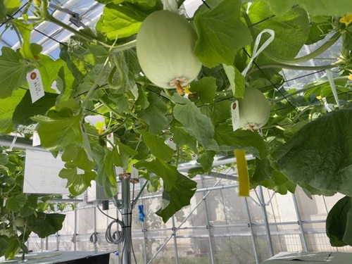 従来の土壌栽培では、年間をつうじてメロン1株から2~3玉を収穫するところ、支柱を利用してメロンを空中で水耕栽培することで、4カ月程度で平均30~40玉の収穫が可能になる。同技術で栽培したメロンは市場で高く評価され、品質の良さが特徴のひとつとなっている。