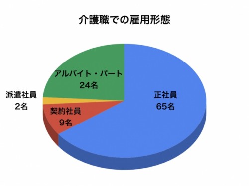 スタルジーでは、介護職として働いている人、もしくは過去に働いていた人100人に対して、仕事上の悩み、退職理由、転職に関してアンケート調査を実施した。 まず「介護職の雇用形態」は「正社員」が65名で最多