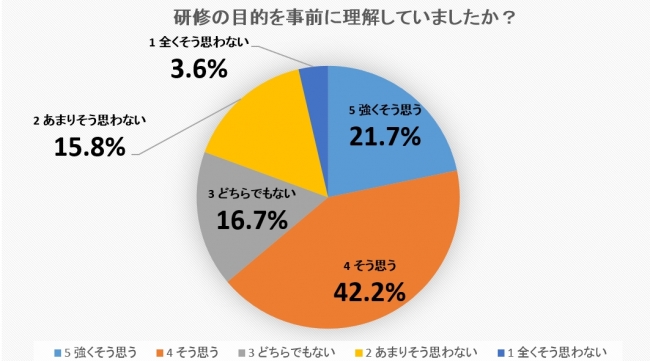 アルヴァスデザインは、民間企業に勤務する社員(1160名)を対象に、研修受講に対する意識調査を行った。 「受講した研修の目的を事前に理解していたか?」という問いに5段階で答えてもらったところ、5段階中
