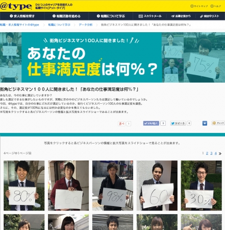 キャリアデザインセンターは、7月9日、転職サイト「@type」において、「街角ビジネスマン100人に聞きました!あなたの仕事満足度は何%?」をリリースした。 100人の仕事満足度を調査した結果、平均満