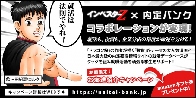 ネクストマーケティングが運営する「内定バンク」( https://naitei-bank.jp/ )は、投資マンガ「インベスターZ」とのコラボレーション企画の実施を発表した。 「内定バンク」は、内定体