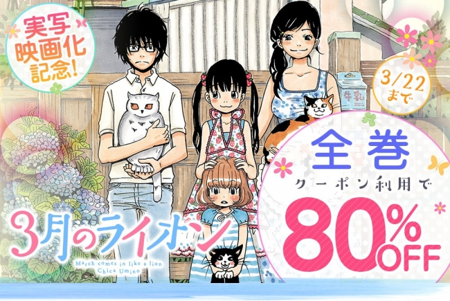 実写映画化を記念し、「BOOK☆WALKER」では、3月13日~22日23時59分の期間、特設サイト上で公開するクーポンを使うと、「3月のライオン」全巻を80%OFFで購入できるキャンペーンを実施する