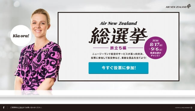 ニュージーランド航空は、8月17日~9月6日まで、「ニュージーランド航空総選挙 ━旅立ち編━」を実施する。 本キャンペーンは、搭乗から降機まで、利用客が空の旅で体験するサービスを8つの部門(選挙区)に