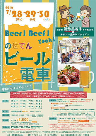 能勢電鉄では、夏の風物詩として定着した「のせでんビール電車」を7月28日~30日の3日間、運行する。 特別貸切電車に仕立てた「のせでん風鈴電車」の車内で、風鈴の音を聴きながら高級生ビールと希少な能勢黒