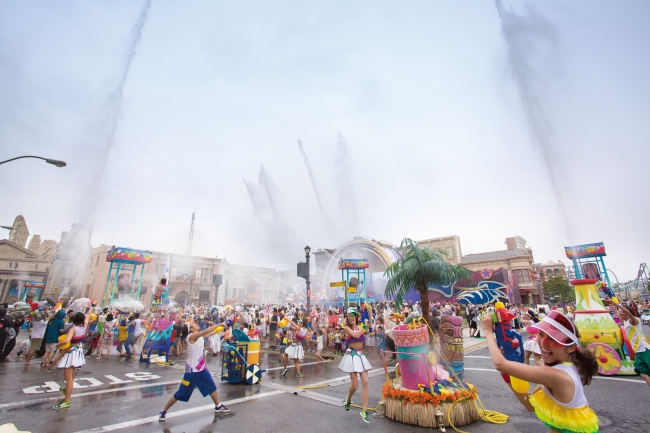ユニバーサル・スタジオ・ジャパンは、7月1日にグランドオープンする「15周年・やり過ぎの夏」の開幕に先駆けて、6月30日、プレスプレビューをした。 正午頃には、パークの夏の風物詩である「水かけ祭り」に