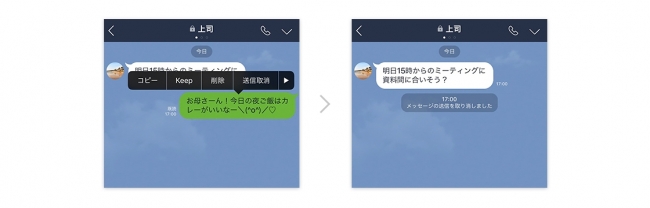 LINEは、同社が運営するコミュニケーションアプリ「LINE」にて、24時間以内に誤送信したメッセージを取り消しできる「送信取消」機能を、12月13日より提供開始した。 メッセージの取り消しは、誤送信