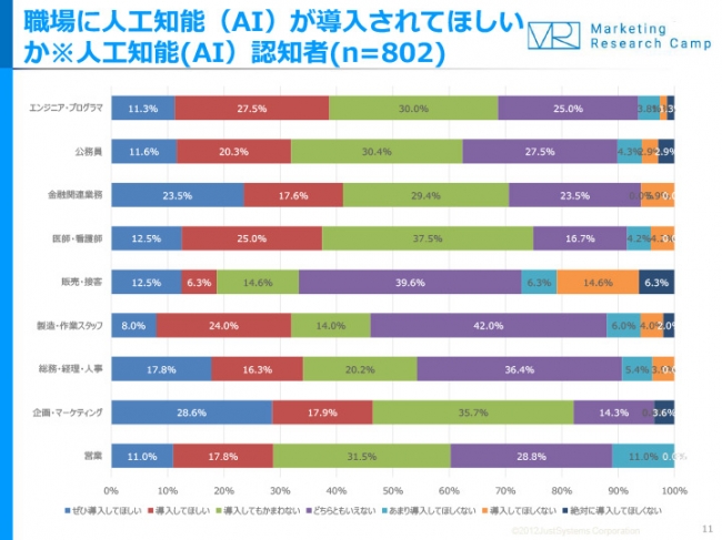 ジャストシステムは、ネットリサーチサービス「Fastask」を利用して「職業別の仕事と人工知能に関する実態調査」を実施、その結果を発表した。 まず、営業職に従事する人のうち、「将来的に自分の仕事がすべ