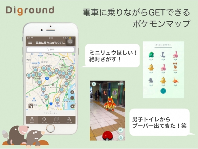 シンクスマイルが運営する、MAPまとめアプリ「Diground」は、首都圏200駅をカバーする「近くにいるポケモン」をまとめたMAPを公開した。 Digroundは、地図上に写真やコメントを記録してい