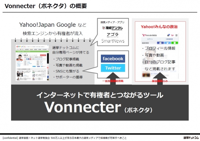 選挙ドットコムは、参議院議員選挙に立候補する現職及び、新人候補者が利用できる有権者とつながるツール「Vonnecter(ボネクタ)」をリリースする。 「Vonnecter」は、Voter(有権者)とC