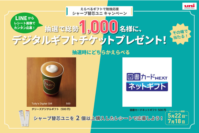 三菱鉛筆は、5月22日~7月18日まで、えらべるギフトで学生の勉強シーンを応援する「シャープ替芯ユニ キャンペーン」を実施する。シャープ替芯「uni(ユニ)」を2個以上購入したレシート画像で応募すると