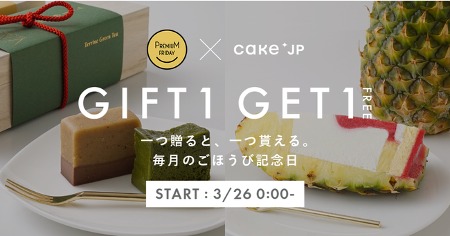 Cake.jpは、3月26日~28日の間、対象商品を購入した人に、無料でプレミアムな商品を届けるキャンペーン「GIFT1GET1FREE」を開催する。 GIFT1(贈る)対象スイーツを購入した人に、C