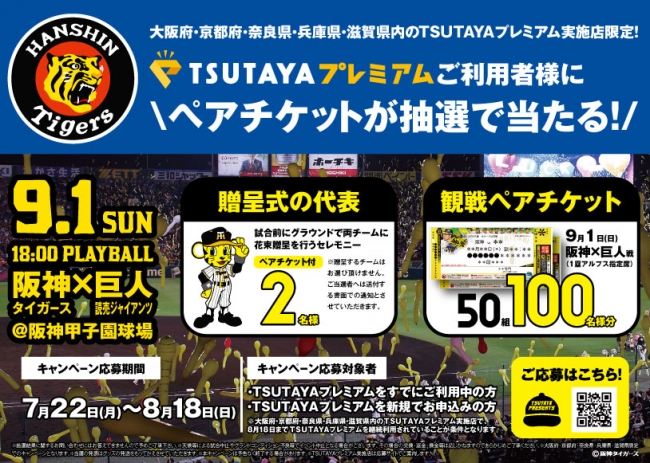 関西TSUTAYAは、昨年に引き続き、9月1日阪神甲子園球場にて、「TSUTAYA PRESENTS TSUTAYAプレミアムナイター阪神タイガース×読売ジャイアンツ」を開催する。 開催に伴い、店舗レ