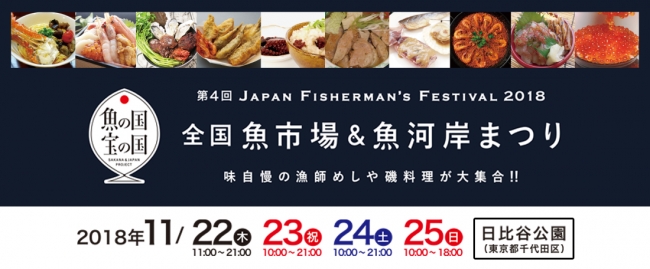 11月22日~25日の4日間、東京・日比谷公園にて、「第4回 ジャパンフィッシャーマンズフェスティバル2018 ~全国魚市場&魚河岸まつり~」を開催する。 日本各地の魚介料理が大集合する「さかな祭り」