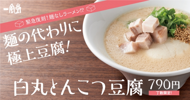 力の源カンパニーが運営する一風堂は、看板ラーメン「白丸元味(しろまるもとあじ)」の麺を豆腐に置き換えた「白丸とんこつ豆腐」を、豆腐の日である10月2日から関東と東海の一風堂39店舗に拡大して販売する。