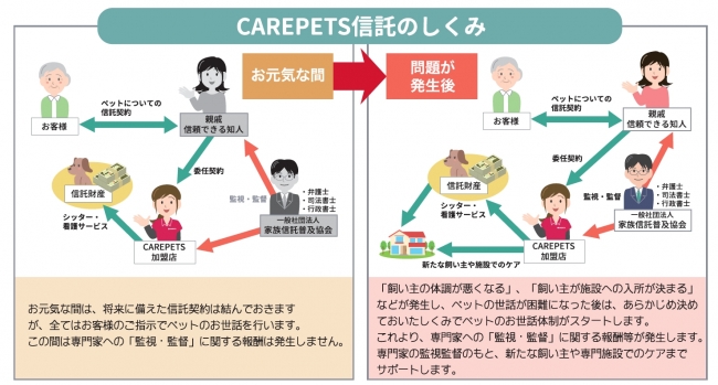 CARE PETS(ケアペッツ)は、人間とペット(主に犬と猫)の「老老介護」時代に対応するため、飼い主の万が一の際にペットの養育を第三者に託すことの出来る「CARE PETS信託」を7月1日より開始す